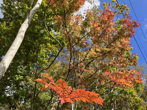 緑とオレンジ色、赤と混ざった木々が、これはこれで美しいです。