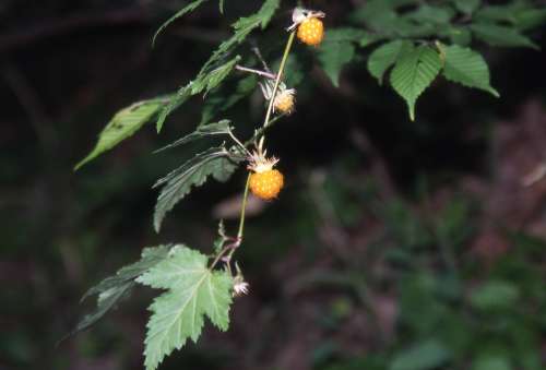 本州中部以北の山野の林縁に生育する落葉低木。キイチゴの代表選手。3~5月に白い花を下向きにつける。果実は6月頃黃色く熟し、甘くておいしい。葉は5裂する物が多く、モミジの葉に似ていることからついた名。