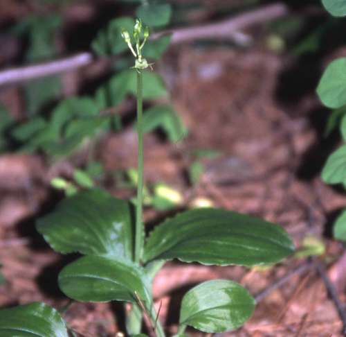 日本全土の比較的標高の高い林內に生育する多年草。6~8月、2枚の葉の間から伸びた花莖に淡緑色または黒褐色の花を5~15個つける。側花弁や萼片は細い筒狀、唇弁は少し幅広く下方に巻き込む。花の形が蜘蛛に似ているので蜘蛛を散らしたような様から蜘蛛散草の字をあてるという説もある。