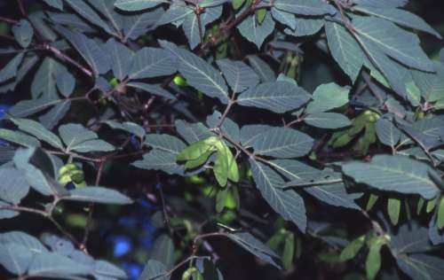 北海道から九州の山野林縁に生育する落葉低木から小高木。3~5月に淡黃白色の小さな花が多數泡立つようにつく。6~8月、果実が暗赤色に熟す。葉は小葉が奇數まとまってつく。枝や幹を煎じて骨折の濕布として用いたので別名がついたと言われ、薬として常に庭に植えてあったことから名前がついたという説がある。