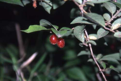 そろそろホテルに戻ろうと歩いていたら、向こうからオーナーさんと愛犬が。散歩の時間と散策の時間が何回も一緒になったことがあるので、「久し振りだね」と話が弾みました。わんちゃんも覚えていてくれたようで、大歓迎!私の足に大きな身體を寄せておしゃべりを聞いていました。ホテルのすぐ橫の林縁ではウグイスカグラが赤い実を葉の影から顔をのぞかせていました。おいしそうな実には細かい毛があるのでミヤマウグイスカグラです。