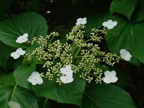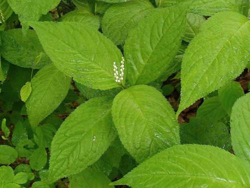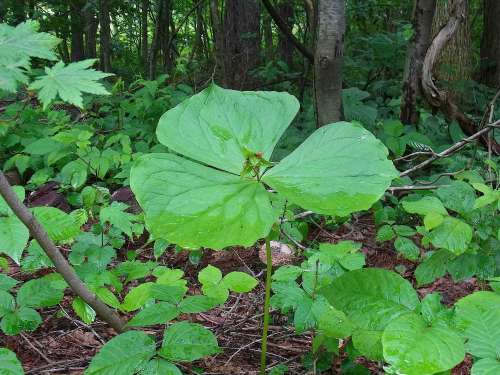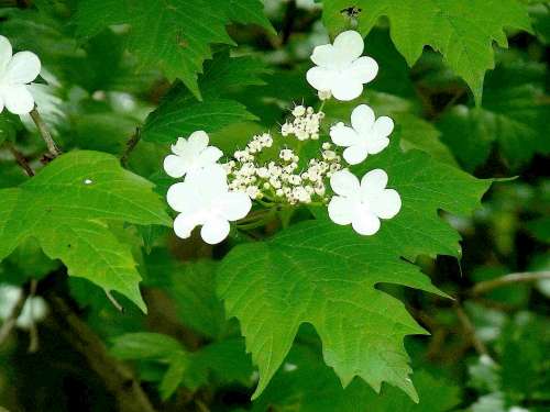 ■左:フタリシズカ(二人靜) センリョウ科センリョウ屬 北海道から九州の山野の林に生育する多年草。4~6月、2~3対の葉の中心から白い小さな花をつけた細い花穂をつける?;ǚ[は2個のことが多いが1~5個と変化がある?;ǚ[が1個のヒトリシズカに対して2個のことが多いことからついた名。 ■右:カンボク(肝木) スイカズラ科ガマズミ屬 北海道から本州中部以北の山地から深山に生育する落葉小高木。5~7月、5裂した裝飾花に囲まれたガクアジサイのような花の固まりをつける。秋に赤く熟す果実は鳥が好まないのかいつまでも殘る。似ているヤブデマリは裝飾花の1枚が小さいがカンボクはほぼ同じ。ムシカリの葉は亀の甲羅のような形をしているがカンボクは深く3裂している點が違う。名前は薬として使っていたことから『肝要な木』とついたという説がある。