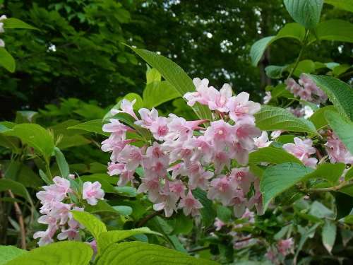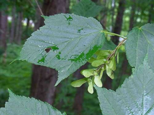 道が交差する辺りで樹に絡まった蔓に白い花が咲いているのをみつけました。イワガラミだろうか、ツルアジサイだろうかと近寄ってみると。4弁の萼を持つツルアジサイでした。イワガラミは1枚です。先程見たカンボクの花にもよく似ていますが、カンボクは萼片は5枚?;à坤堡扦庖姺证堡毪长趣扦蓼埂?br /> 白い花が多いこの時期、目を惹く鮮やかなピンク色の花はタニウツギです。松川地熱発電所橫の川沿いでも、何株も綺麗な花をつけていました。上を見るとウリハダカエデが実をつけていました。他のカエデの実もまだ緑色ですが、秋になるとクルクル舞いながら風に乗って飛ぶのがあちらこちらで見られるでしょう。
