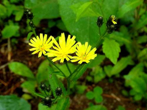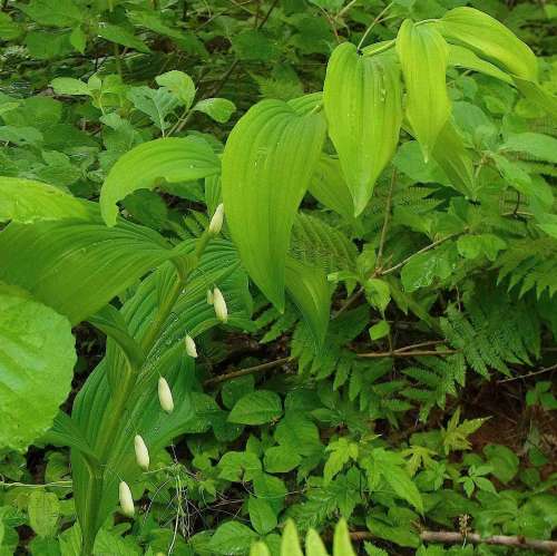 小雨が降ってきたので下の方を見ながら歩いていると、孔雀が羽根を広げたような綺麗な姿をしたクジャクシダがありました。トゲトゲした蕾のコウゾリナと、地面に張り付くように生えているコナスビなどの、黃色い花も何種類か見ることができました。 管理作業が終わった道に出たので、除草の終わった道沿いでは、花は期待できないか、と思いながら歩いていると、林の中でも見たアマドコロの大きな株が殘してありました。機械で刈る際、手間がかかるのでしょうが、こんなところに細かい気遣いが感じられます。後で管理員さんとお話しした時も「アマドコロが咲いていますよ」と教えて頂きました。