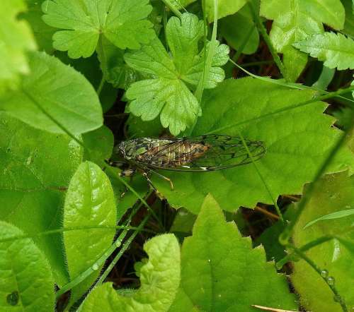 このあと、現地からも近い八幡平ロイヤルホテルの向かい側にある巖手県県民の森を少しだけ散策。エゾハルゼミの大合唱に包まれた林の下ではササバギンランがひっそりと咲いていました。近くの草の上にはエゾハルゼミが。力つきたのか動かないで手に取り観察すると、腹弁(発音器の一部)がなく産卵管がある雌でした。近くの広場は、広々とした草原と緑の樹々、そして青い空をバックにそびえ立つ雄大な巖手山、という素晴らしい景観が見られるビューポイントです。