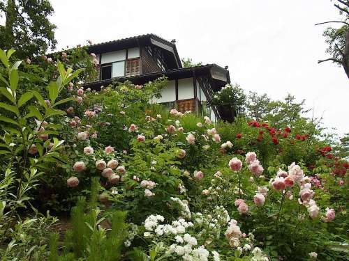 近くにある「ばら観音」と呼ばれる大光寺も、丹精込めて育てられた1,000本を超えるバラが満開の花で迎えてくれました。一段下にある中央公園へ下る斜面にもバラが植えてあり、見上げるとバラの背景に日本家屋が、という他ではあまり見られない景色を見ることができます。ちょうどご住職の法話中だったようで、時々楽しそうな笑い聲が聞こえてきたのですが、今回はお話しをうかがう時間がなく殘念でした。