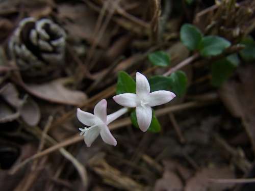 松林に足を踏み入れるとツルアリドオシの白い小さな花が枯れ葉の間から顔を出していました。近くに寄ってみると花弁の縁がうっすら赤みがかっています。中には縁取りのように、はっきりと赤くなったものも。この花はどれも仲良く2個ずつつくのが特徴で、花の付け根をよく見ると1つの場所から出ています。子房が1つなので秋に赤く熟す実も1つ。花がついていた跡が耳のように2ヶ所殘る特徴的な形をした実です。