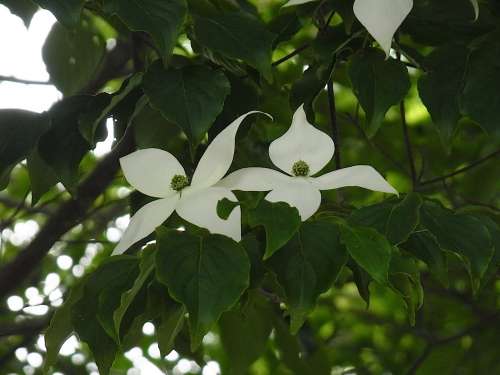 この時期、緑が濃くなり始めた林の中で目を引くのはヤマボウシの花です。4枚の白い花弁のように見えるのは苞で、中心にあるコンペイトウのような形をしたものが小さな花のかたまりです。秋には2センチほどの丸い実が赤く熟し、食べることができます。中のタネが少し気になりますが、甘くて美味しい実です。