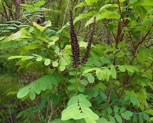 南アメリカ原産落葉低木。法面緑化などに使われたものが野生化している。5~6月、穂狀に黒紫の花を多數(shù)つけ、開花時には黃色い葯が飛び出す。豆果は約1cmで中の種子は1個。名はハギに似た葉でイタチの尾に似た花をつけることからついた。