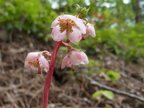 少し暗い道沿いの斜面では、マツの落ち葉の間からイチヤクソウが花莖を伸ばしてウメのような花をつけていました。花の色がピンクがかっているのでベニバナイチヤクソウかと花をのぞいて見ると葯は黃色。ベニバナイチヤクソウの葯は赤紫色なので、これはイチヤクソウのようです。