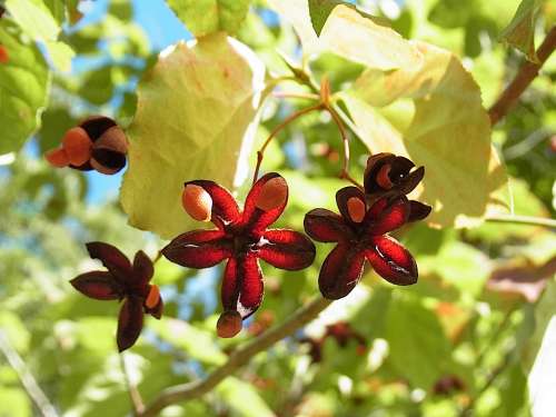 北海道から九州の山地に生育する落葉低木~小高木。5~6月につける淡緑色の花は花莖が長く枝から吊り下がる。9~10月、紅色に熟した果実が5つに割れ、朱赤色の種子が顔を出す。名前は花や果実がぶら下がる様子からついた。