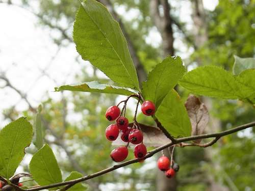 この日はまず現地に向かいました。八幡平リゾートは盛岡市內から50分ほどで到著します。八幡平リゾートは樹々に囲まれたエリアと樹が少なく開けたエリアがあり、景色や環境の違いを楽しむ事ができます。今回は樹々に囲まれたエリアから散策を始めました。さっそく5弁の花のように実が割れ、オレンジ色のタネが吊り下がっているツリバナが目に入りました。カマツカも赤い実をつけています。藍色の実をつけているのはサワフタギです。鮮やかな赤い実をつけたガマズミが遠くからでもよく目立つように、この時期はカラフルな実が多く見られます。歩いているとついそちらに目が行ってしまいますが、足元には大きな葉の間から立ち上がった莖に丸い玉がいくつもついたタマブキや、ひげのようなタネをつけたクサボタン、イカリソウの葉などもありました。今回は花の時期ではなかったので、タネや葉しか見られませんでしたが、春からは様々な花が次々と咲き林床を彩ることでしょう。