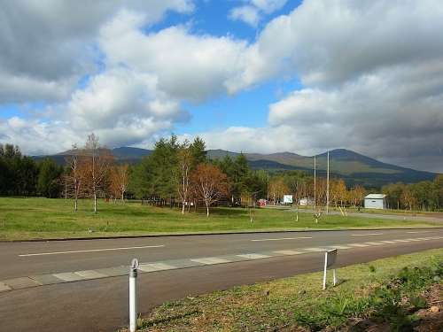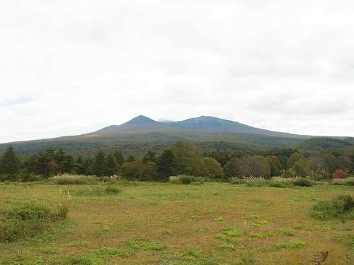 八甲田ゴールドライン沿い標高約500mにある高原。草原の先に北部八甲田山系の山々がそびえ立つ。八甲田山という獨立峰はない。左から八甲田山系の中で一番北にある前嶽(1,252m)、赤倉岳(1,548m、この日は雲に隠れていた)、八甲田ロープウェイが設置されている田茂萢(タモヤチ)岳(1,324m)が並ぶ。日本百名山、新日本百名山。