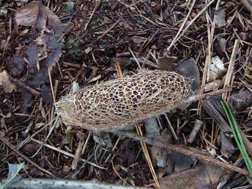 日當たりのよい場所ではノコンギクが群生し、寒さに負けずにたくさん花をつけています。まだ蕾もあるので強い霜が降りなければ良いなと思いながら近くの林の中に入ってみると、ユニークな形をしたスッポンダケが倒れているのをみつけました。近くにはクスサンの繭も落ちています。この繭は作りかけのように見えますが、これが完成品。中の蛹が透けて見えるため、透かし俵(スカシダワラ)とも呼ばれます。この夏から秋にかけて羽化して空き家になった繭が風で飛ばされたのでしょうか。