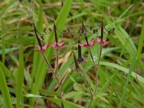 北海道から九州の草地などに生育する多年草。7~10月、長い柄の先に5弁の小さい花を2個ずつつける。東日本は白、西日本は紅紫色が多い。果実は熟すと5つに裂け先端にタネをつけ巻き上がる。この姿が神輿の屋根に似ていることからミコシグサ(神輿草)という別名がある。古くから下痢止めなどに使われ、効き目がすみやかなことからつけられた名。