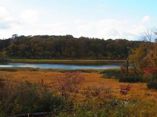 焼山は山の東に後生掛溫泉、西に玉川溫泉が湧き出ています。まずはアスピーテラインを後生掛溫泉へ。途中、八幡平ビジターセンターの前に広がる大沼に立ち寄りました。大沼の外周と南側に広がる大沼濕原には自然探勝路が整備され、道路から下りるとすぐに木道が植物の間に設置されていました。この木道は途中まで車椅子も利用が可能なので、春のミズバショウやエゾノリュウキンカから始まり、次々と咲く濕原植物や水鳥などを気軽に楽しむことができそうです。この日は秋空の元、空の青を映し込んだ沼と周囲の樹々の紅葉、足元に広がる草紅葉が絵のような景観を作っていました。