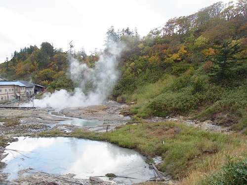 アスピーテラインから少し入ったところに、大きな水たまりから湯気が出ているような不思議な景色がありました。ここが「馬で來て足駄で帰る後生掛」と後生掛溫泉です。箱蒸し風呂や泥風呂、地熱で床を暖めたオンドル部屋などがあり、湯治宿として古くから知られています。宿の奧には自然研究路があり、いくつもの火山活動を間近で見ることができるそうです。
