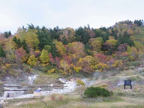 後生掛溫泉からアスピーテラインをさらに八幡平に向かって進み、少し奧に入った標高1,100mの場所には八幡平最古の湯の蒸ノ湯(ふけのゆ)溫泉があります。地熱を利用した『蒸かしの湯』が有名だったことから『蒸ノ湯』とついたそうです。宿の前から見ると錦に染まる樹々に囲まれた谷の所々から湯気が立ち上がり、露天風呂の囲いと地熱浴オンドルの小屋がぽつんぽつんと建っています。こんな野趣溢れる溫泉でゆっくりするのもいいな、などと思いましたが、今日は溫泉につかっている時間はありません。次の溫泉へと向かいます。