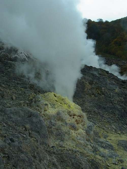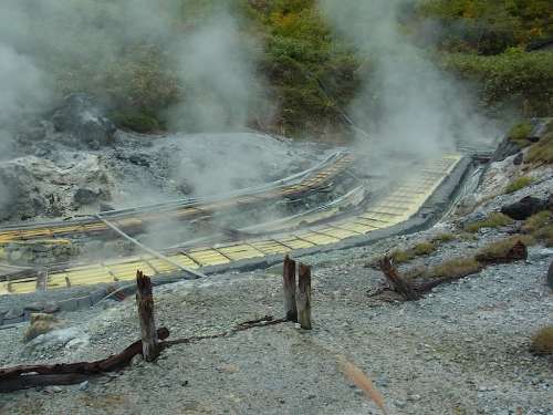 100ヶ所以上ある噴気孔から100度以上の水蒸気と硫化水素や二酸化イオウなどのガスが音をたてて吹き上がる。噴気孔の周りはイオウの固まりで黃色くなっている。玉川溫泉は『北投石(ほくとうせき)』(國の特別天然記念物)というラジウムを含む放射性を有する鉱物の日本で唯一の産地でもあるが、これも溫泉の成分が結晶堆積したもの。