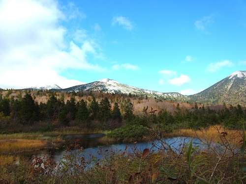 北部八甲田山系が見渡せる。右から高田大岳(1,552m)、小岳(1,478m)、八甲田大岳(1,584m)。八甲田山系は北部八甲田山系を南部八甲田山系に分かれているが、一般的に八甲田山というと最高峰の八甲田大岳を含む北部八甲田山系を指すことが多いらしい。八甲田の由來は「八の(たくさん)峰と、多くの田代(濕原)があることからついたといわれる。