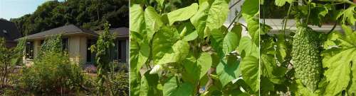 ■左:K様邸 日當たりのよい開放的な庭にタネから育てたヒマワリやキバナコスモス、ヒャクニチソウなどの花が色を添える。シロバナユウガオ(ヨルガオ)やゴーヤ(ツルレイシ)などのグリーンカーテンが日差しだけでなく視線を適度に遮っている。グリーンカーテンの支柱や、拾い集めた石などでの花壇の縁取りはお手製。 ■中:シロバナユウガオ(白花夕顔)の蕾 ヒルガオ科サツマイモ屬 熱帯アメリカ原産の多年草(日本では1年草扱い)の園蕓品種。7~11月にアサガオのような形をした大きな白い花をつける。花は夕方から咲き翌朝にはしぼむ。夕顔とつくが正式にはヨルガオ(夜顔)の一種で、果実から干瓢(かんぴょう)を作るユウガオはウリ科ユウガオ屬で別の植物。 ■右:ツルレイシ(蔓茘枝) 別名ゴーヤ、ゴーヤー、ニガウリ ウリ科ツルレイシ屬 熱帯アジア原産のつる性1年草。5~10月に黃色い花をつける。食用にしている緑色の果皮は未熟の段階で苦く、熟すと橙色になり裂開する。中の種子を包む赤いゼリー狀の仮種皮は甘い。 イボに覆われた外観と、熟すと仮種皮が甘くなることがムクロジ科のレイシ(=ライチ。中國名『茘枝』の音読み)に似ていて、つる性であることからついた名。ゴーヤは沖縄での呼び名。