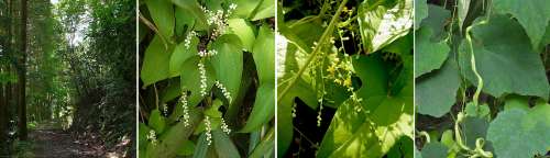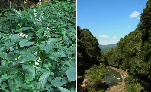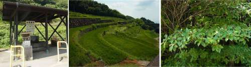現地案內所から歩き始めると、グリーンカーテンが屋根まで伸びたお宅がありました。シロバナユウガオ(ヨルガオ)やゴーヤ(ツルレイシ)、キュウリ、アサガオが青々と育ち、まるでグリーンカーテンの見本園のようです。庭の植物の多くはオーナーのK様がタネから育てたもので、グリーンカーテンのゴーヤもタネから育てたそうです。ゴーヤとキュウリには花と食べ頃の実がついていました。1年草だけでなく14本のアンズもタネから育てた樹だとか。植物ごとに分けられた花壇の仕切りも石や竹、丸太などを使った手作り。その花壇では、こぼれダネから育ったヒャクニチソウががっしりとした莖に大きな花をつけています。庭を一目見たときに懐かしさを感じたのは、ちょうど咲いていたヒマワリ、ヒャクニチソウ、キバナコスモスなどの花とこの手作りの仕切りからでしょうか。シロバナユウガオのたくさんの蕾が咲く夕方まではいられませんでしたが、この日も大きな真っ白い花が道を通る人の目を楽しませてくれたでしょう。杵築は瀬戸內海式気候のため溫暖で雨が少ない穏やかな気候が特徴。分譲地は日當たりの良い場所が多いので、近くにみかん畑があることからもわかるように柑橘類をはじめ、オリーブやミモザの仲間などを育てるのにも良い環境です。シンボルツリーに1本植えてみてはいかがでしょうか。