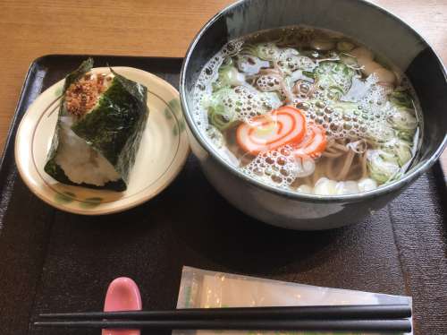 この棚田の駐車場には売店と食堂があり、ここで収穫したお米で握ったおにぎりを試食することが出來ます。 せっかくなので、おそばとセットで頂きました!
