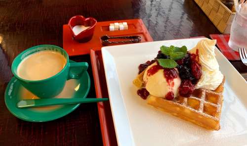その後、少し車を走らせて「一互一笑」というカフェへやってきました。 ベリーワッフルを頂きました 和風のステキな店內で、ハート形のミルクポットが可愛いかったです♡