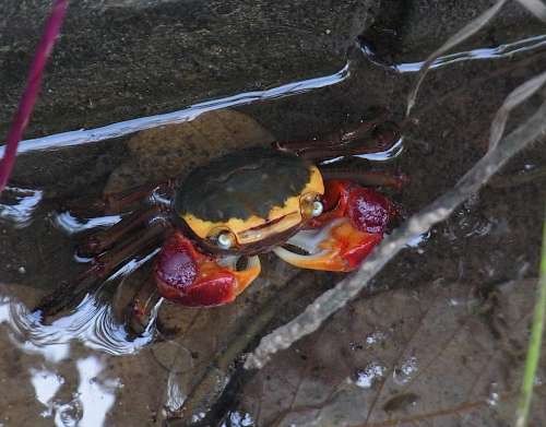 昨日は雨でゆっくり歩けなかったので、もう一度別府灣杵築リゾートに向かいました。魅力のひとつであるプライベートビーチのような砂浜からは別府灣が一望でき、遠くには四國を見ることもできます。この浜は権現鼻と加貫鼻と呼ばれる岬に挾まれていて、砂浜だけでなく巖礁地もあるためさまざまな海の恵を獲ることができるそうです。分譲地內を歩いていると、街路樹にとまったカブトムシを発見!手前にかかっていたナガコガネグモ立派な巣を壊さないように注意しながら、取材スタッフ全員での撮影會になりました。 昨日濡れ貍のようだったタヌキマメは咲いているかな?と行ってみると、毛に覆われた萼を大きく開き青紫色の花が顔を出していました。近くに以前ナンバンギセルをみつけた場所があるのを思い出し行ってみると、ちょうど咲いていて淡い赤紫色の花に今年も會うことができました。寫真を撮っていると赤い物が視界の端を橫切ったので足元の溝の中を見ると、サワガニよりだいぶ大きいカニが物陰に隠れようと行ったり來たり。こんな垂直の崖の上にカニ?と思いながら溝沿いを橫歩きで追いかけっこをして、やっと寫真を撮ることができました。後で調べてみるとアカテガニという陸上で暮らすカニで、子どもの時期のわずかな間だけ海にいて、やがて陸地に上がり森や林で暮らすのだそうです。