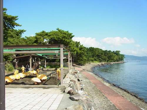 この日は別府市內から現地に向かう途中にある『別府海浜砂場』からスタートしました。ここは別府八湯の1つ『亀川溫泉』にある別府市営の砂風呂です。脫衣所などがある建物を通り抜けると目の前には別府灣の青い海が広がります。浴衣に著替えた入浴客が砂に橫たわると、砂かけさんが鮮やかな鍬さばきで砂をかけ、アッという間に砂から出ているのは頭だけになっていました。別府市には「砂かけマイスター」という認定制度もあるそうです。波の音を聞きながら、じっと我慢の15分。砂の溫かさと重さがちょうど良い加減のようで、みなさん気持ち良さそうでした。日除けにパラソルを立てかけてくれますが、可動式屋根もあるので雨の日でも利用できるそうです。 今回はビジネスホテルの溫泉しか入れませんでしたが、次回はぜひ砂風呂を體験したいと思います。撮影の間、海沿いを歩いていると無數のアオスジアゲハが舞っていました。溫泉や海水からミネラルを補給するために給水するといわれています。アゲハチョウも數頭混ざり、ひらひらと舞いながら時々砂地にとまり、給水していました。