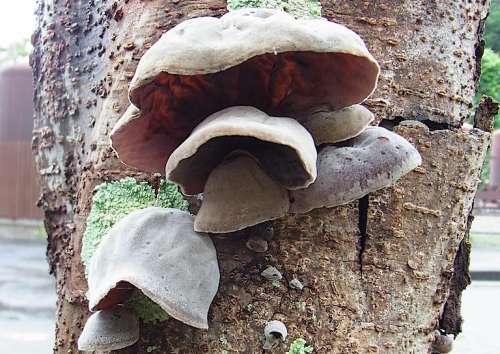■左:ケヤキハフクロフシ(欅葉袋付子、欅葉袋附子、欅葉袋五倍子) 北海道から九州のヤケキなどニレ科の植物に発生する。アブラムシ科ワタムシ亜科のケヤキヒトスジワタムシ(別名:ケヤキフシアブラムシ、ケヤキヒトスジタマワタムシ)の幼蟲が作った蟲えい。5~6月に有翅蟲になりタケやササの根に移動、繁殖し、秋にケヤキなどに戻り樹皮の裂け目などに卵を産む。 ■左中:アラゲキクラゲ(粗毛木耳)キクラゲ科キクラゲ屬 世界中の熱帯から溫帯の広葉樹に生育する木材腐朽菌。春から秋に発生する。キクラゲに比べ肉厚でかたい。食用に人工栽培も行われている。細毛が密生し食感がクラゲに似ていることからついた名。 ■右中:ヘクソカズラ(屁糞蔓、屁臭蔓)別名ヤイトバナ、サオトメカズラ アカネ科ヘクソカズラ屬 日本全土の日當りのよいやぶや草原などに生育するつる性の多年草。8~9月、灰白色の花をまとめてつける。花は筒狀で先端が5裂し中心と筒の中は紅紫色。果実は黃褐色。全草を傷つけたりもんだりすると不快な臭気がすることからついた名。別名は花の中心が灸(やいと)の跡に見えること、花の形が早乙女(田植えをする女性)のかぶった笠に似ていることから。 ■右:オオニシキソウ(大錦草)トウダイグサ科トウダイグサ屬 本州から沖縄の荒れ地や道端などに生育する北アメリカ、南アメリカ原産の1年草。6~10月に小さな白い花弁に見える付屬體をつけた1つの雌花と複數の雄花とがまとまってつく。枝などに傷をつけると白い乳液が出る。地面にはり付くように枝を伸ばすニシキソウ、コニシキソウとよく似るが、立ち上がり20~40cmになる。名前もここからついた。