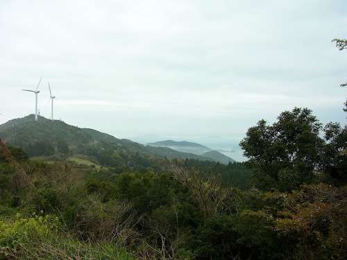 風車は道路沿いにあるので、すぐ近くで大きさを體感することができます。青い海と空、緑の山、そして白い風車を眺められる場所もありますが、進むうちに霧が出てきました。海抜0mから一気に立ち上がった標高300m近くの山並みが続く佐田岬の特徴でしょうか。樹々に覆われた斜面に海からの風が當たり、次々と霧が生まれる様子が下に見え、まるで雲上人になったような不思議な気分でした。周辺のヤマザクラの花はまだチラホラ。殘念ながら桜色が加わった景色は見られませんでした。