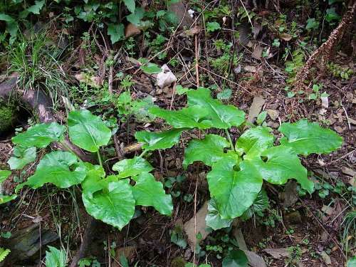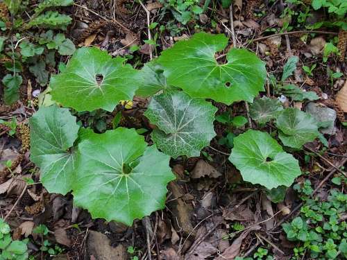 近くのまだ緑の少ない林縁では艶のある2種類の葉が目を引きました。ひとつは伊方町の花のツワブキ。花が少ない冬に鮮やかな黃色い花をつけ、海岸近くの巖場や林を彩ります。道沿いで摘んでいた人は莖をきゃらぶきにするのでしょうか。もうひとつはウバユリです。先が尖った細長いハート形の葉は夏には枯れ、すっと立ち上がった莖にテッポウユリに似た緑がかった白い花をつけます。