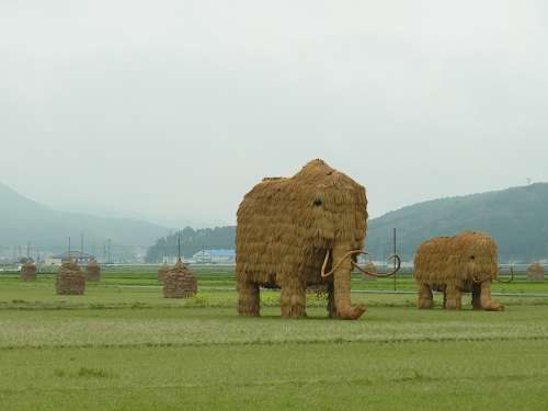 宇和島市から八幡浜市に向かう途中、宇和盆地の田園風景の中を走る予讃線に沿った道を進んでいると、田んぼの中に突然マンモスが現れました。稲藁でつくったマンモスの親子です。周辺には藁が積み上げられ塔の様な形をしたものが點々とあります。伊予石城駅の近くには同じ形のモニュメントも。あとで調べてみると、宇和地方で『わらぐろ』と呼ばれる脫穀した後の藁を保管するためのもので、日本ジオパークに登録されている宇和盆地の稲作文化の歴史や景観を伝える風物詩として守られているそうです。4月29日に開催される『宇和れんげまつり』のマスコット的存在の親子マンモスは、3月下旬頃から祭りが終わるまでの間、道行く人や予讃線の乗客を楽しませてくれるようです。