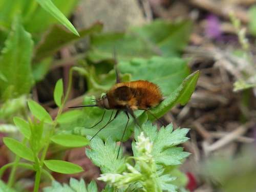 分譲地內にあるムカイパークへ向かうと、まだ枯れ草が目立つ広い草原にキジムシロやコハコベなどが點々と咲いていました。草の上に茶色い毛玉?と思って近づいてみると、ホバリングが得意なビロードツリアブでした。コロコロした體と長い口吻(こうふん)が特徴の成蟲は、春にだけ現れる春の使者です。