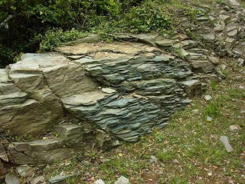 佐田岬は中央構造線の南側にある三波川変成帯に屬し、大部分が緑色片巖で構成されている。この地方の緑色片巖は伊予青石とも呼ばれ、石材として珍重される。伊方町では古くから波止や石垣などに使われ、特徴的な景観を作っている。薄い板狀の巖を積んだような層も海辺や道沿いなどで見ることができる