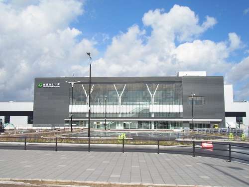 ■新函館北斗駅駅舎 開(kāi)業(yè)に向け整備が進(jìn)められる新函館北斗駅周辺。(H27年10月撮影) 函館本線(xiàn)渡島大野(おしまおおの)駅(無(wú)人駅)に併設(shè)される形で建設(shè)された新函館北斗駅駅舎。2016年3月26日北海道新幹線(xiàn)開(kāi)業(yè)に伴い新函館北斗駅と改稱(chēng)し、この駅舎に替わった。外観はゲート風(fēng)、ガラス越しに見(jiàn)える柱はトラピスト修道院のポプラ並木をイメージし、內(nèi)は道南スギがあしらわれている。