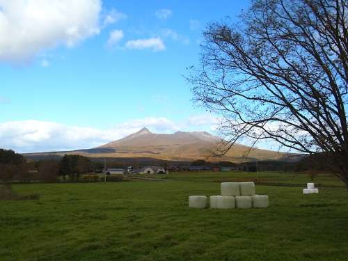 新函館北斗駅から國(guó)道5號(hào)線(xiàn)(通稱(chēng):大沼國(guó)道)を北に走り、大沼トンネルを抜けた先を右に折れると鹿部方面に向かう道に入ります。函館本線(xiàn)と並走するこの道は、駒ヶ岳と大沼を背景に走る函館本線(xiàn)の電車(chē)を撮影できる場(chǎng)所として知られています。さらに進(jìn)んで道道43號(hào)線(xiàn)(通稱(chēng):大沼公園鹿部線(xiàn))を走り、牧草地が広がり始めた辺りで南東に1本入った通稱(chēng)ミルクロードから駒ヶ岳を見(jiàn)てみました。牧草ロールが積まれた牧草地の先に左から最高峰の剣ケ峯、手前に馬の背、右に砂原(さわら)岳と並んでいます。なだらかな裾野をひいた女性的な姿です
