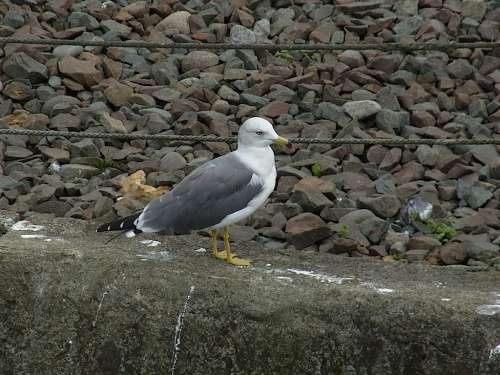■左:鹿部川のサケ遡上 鹿部郵便局近くを流れる鹿部川両岸には『せせらぎ散歩道』が整備され、9~11月頃には川を次々と遡上するサケを見(jiàn)ることができる。海沿いに架かる『うろこ橋』の近くでは力盡きたサケを狙ってか多くのウミネコが集まっていた。 ■右:ウミネコ(海貓) カモメ科カモメ屬 全國(guó)の海岸や港、河口などで見(jiàn)ることができる留鳥(niǎo)、または漂鳥(niǎo)。體長(zhǎng)は45cm前後。成鳥(niǎo)の頭部と腹部は白色、背と翼の上部は黒灰色。尾の先にある黒い帯が成鳥(niǎo)になっても消えないのは日本のカモメ類(lèi)でウミネコだけ。嘴は黃色で先端に黒と赤の斑がある。肢は黃色。ネコのような聲で鳴くのでついた名。