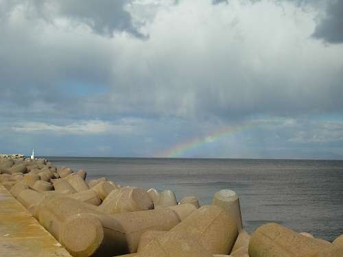 海辺の町なので漁港からの駒ヶ岳も見(jiàn)てみようと、鹿部川の近くにある本別漁港にも立ち寄ってみました。何隻もの漁船が係留された先に長(zhǎng)い裾野を広げる駒ヶ岳の姿は北海道の漁業(yè)の町らしい風(fēng)景です。足元や防波堤の隙間に生えているハマアカザの寫(xiě)真を撮っていると「虹だ!」という聲がしたので、顔を上げると內(nèi)浦灣から立ち上がる虹が。海の上に架かる虹を見(jiàn)るのは初めてでした。