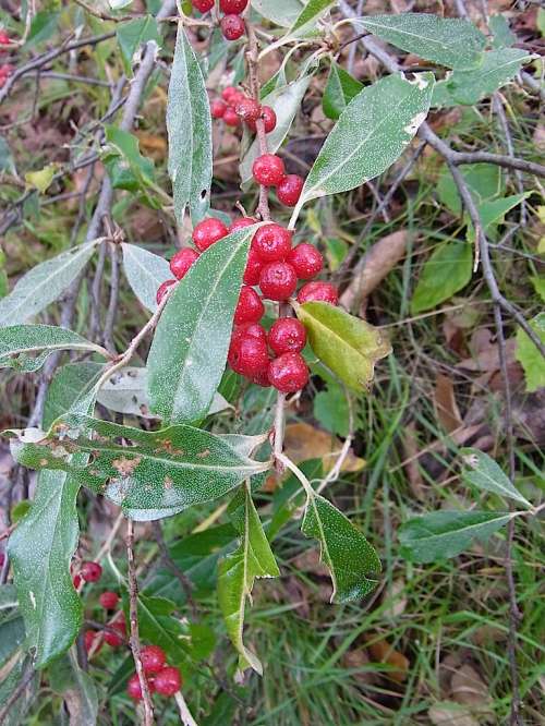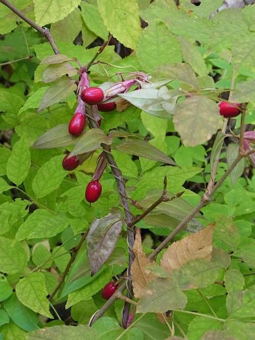 ■左:アキグミ(秋茱萸)の果実 グミ科グミ屬 北海道から九州の原野や河原などに生育する落葉低木。4~6月甘い香りのある白から淡い黃色の花を葉の元にびっしりつける。秋に丸い果実が赤く熟す。葉は表面に白い點(diǎn)々があり、裏面は銀色の毛で覆われる。グミは秋咲きと春?jiǎn)Dきの種類(lèi)があるが、アキグミは春?jiǎn)Dきの代表種。秋に果実が熟すのでついた名。グミは漢名『茱萸』の読みからという説やグイ(刺)ミ(実)が転訛したという説がある。 ■右:ツルリンドウ(蔓竜膽、蔓龍膽)の果実 リンドウ科ツルリンドウ屬 北海道から九州の山地の林縁などに生育するつる性多年草。8~9月に釣鐘狀の淡い紫色の花をつける。果実は熟すと赤く色づき豆電球のように莖から下がる。つるは紫色を帯びる。リンドウの仲間でつる性ということからついた名。リンドウは漢名のリュウタン(竜膽、龍膽)が転じた。