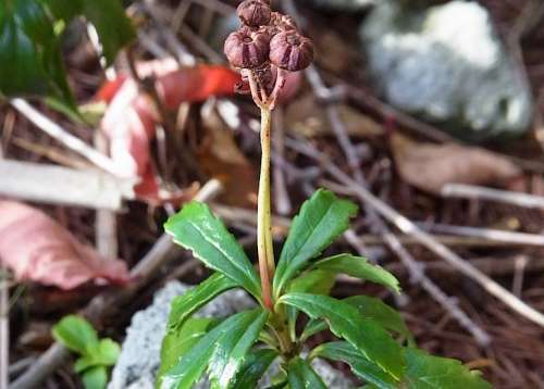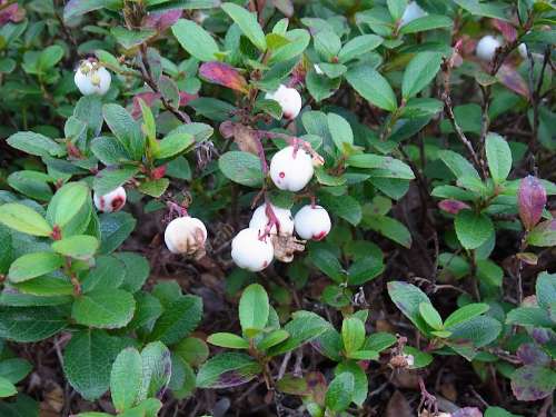 ■左:シラタマノキ(白玉の木)の果実 別名シロモノ ツツジ科シラタマノキ屬 北海道から本州中部以北、三瓶山、大山の高山や亜高山帯の草地や林縁に生育する常緑低木。7~8月、スズランに似た白い壺狀の花をつける。果実は白色、ときに淡紅白色で9月頃に熟す。果肉をつぶすと濕布薬のような匂いがする。果実が白い球狀になることからついた名。 ■右:オオウメガサソウ(大梅笠草) イチヤクソウ科ウメガサソウ屬 北海道から本州茨城県以北の海岸近くの山地に生育する多年草。6~7月に白から淡紅色の5弁の花を1莖に3~9個(gè)つける。ウメガサソウは1莖に1個(gè)。葉は輪生狀につく。名前は大型のウメガサソウ(花がウメに似ていて、下向きにつける姿を笠に見(jiàn)立てた)。