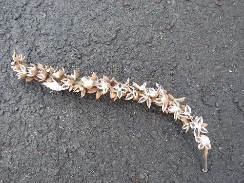 ■左:オトコエシミフクレフシ(男郎花実膨れ附子、五倍子、付子) オトコエシの果実にオトコエシニセハリオタマバエ(タマバエ科)が寄生して球形や扁球形に肥大した蟲(chóng)えい(蟲(chóng)こぶ)。中には數(shù)匹の幼蟲(chóng)が入っている。附子、五倍子、付子はこぶのこと。名前はオトコエシ(植物名)の実(つく場(chǎng)所)が大きく膨れた(形狀)フシ(コブ)という意味。 ■左中:オオアキノキリンソウ(大秋の麒麟草) キク科アキノキリンソウ屬 北海道西南部から本州北部の海岸付近に生育する多年草。9~10月に黃色い花をつける。アキノキリンソウの亜種。アキノキリンソウとの違いは、葉が広い、花が密につく、莖が太い、痩果の上部に毛がある、など。大型のアキノキリンソウ(ベンケイソウ科のキリンソウに花が似ているからことから)の意味。 ■右中:エゾゴマナ(蝦夷胡麻菜) キク科シオン屬 北海道の低地から山林の林縁に生育する多年草。8~9月、傘狀によく分枝した枝先に白色の花をつける。草丈は150cmにもなる。本州に生育するゴマナに比べ草丈が高く、莖に毛が多い點(diǎn)で見(jiàn)分けるといわれてきたが、個(gè)體差がある。名前は北海道に生育し、葉がゴマの葉に似ていて食用になることから菜とついた。 ■右:ヒロハクサフジ(広葉草藤) マメ科ソラマメ屬 北海道から本州の海岸近くに生育する多年草。6~9月に淡青紫色の花を一方に偏ってつける。小葉が10~16個(gè)でクサフジより少ない。名はクサフジより小葉の幅が広いことから。クサフジの名は草本で花などがフジに似ていることからついた。