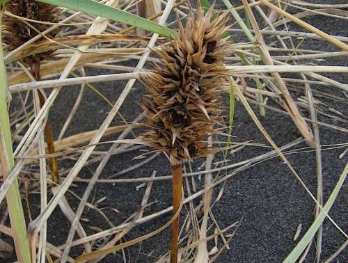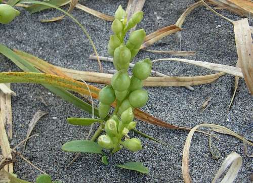■左:ウンラン(海蘭) オオバコ(←ゴマノハグサ)科ウンラン屬 北海道から四國(guó)の海岸に生育する多年草。海浜植物。8~10月に淡黃色で中心が濃い黃色の花をつける。葉は肉厚で莖と共に粉白色を帯び、這うように広がる。海辺に生え、ランに似た花をつけることからついた名だが、ランというよりキンギョソウに似ている。 ■中:オニハマダイコン(鬼浜大根) アブラナ科オニハマダイコン屬 ヨーロッパや北アメリカ原産の帰化植物。1~2年草。海浜植物。6~8月に白色から淡い紫色の小さな花を穂狀につける。果実はだるま狀に2個(gè)重なり上部は大きく先が尖る。風(fēng)で飛ばされたり海流によって短期間で急速に生育地を広げている。ハマダイコン(浜に生育する大根)に似るが剛健なのでオニとついた。 ■右:コウボウムギ(弘法麥) カヤツリグサ科スゲ屬 北海道南西部から九州の海岸の砂地に生育する多年草。雌雄異株。海浜植物。葉は細(xì)長(zhǎng)く厚みがある。花莖は三角柱狀で4~7月に花をつける。雌株の穂は雄株の穂に比べてずんぐりし、莖も太い。古い葉の繊維を筆に使ったことから書(shū)の達(dá)人の弘法大師と、麥に似た穂の形からついた名。 ■左:シロヨモギ(白蓬) キク科ヨモギ屬 北海道から本州の茨城県、新潟県以北の日當(dāng)りのよい海岸砂地などに生育する多年草。海浜植物。全體が白い綿毛で覆われ、雪のように白いことからついた名。8~10月、黃色い花を円錐狀にたくさんつける。筒狀花のみで舌狀花はない。 ■右:ハマナス(浜梨、浜茄子)の実 別名ハマナシ(浜梨) バラ科バラ屬 北海道から本州(太平洋側(cè)は茨城県、日本海側(cè)は島根県まで)の海岸の砂地に生育する落葉低木。海浜植物。6~8月に紅色から紅紫色をした5弁の花をつける?;à?cmほどで芳香がある。8~9月に2~3cmの果実が熟し赤く熟し食べられる。名前は浜に生え果実が梨に似ていることからハマナシがなまったという説や、茄子に例えられたという説がある?!褐菠吾丹衰膝蕙圣工螁Dく頃…?』と『知床旅情』に歌われている。英名はJapanese Rose?;侍渝抛訕敜韦?。