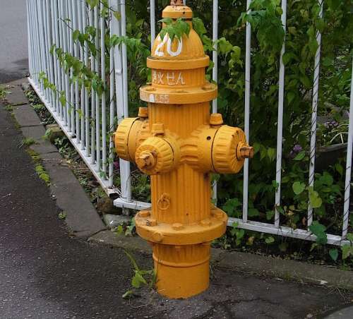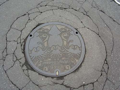 ■左:ご當(dāng)?shù)廿蕙螗郓`ル 函館市には、イカ、五稜郭と舊函館區(qū)公會(huì)堂、函館ハリストス正教會(huì)とカモメ、タコのデザインマンホールがあり、それぞれ無(wú)著色のものと著色されたものがある。 ■右:消火栓 函館市內(nèi)の消火栓。正式名は函館型三方式地上消火栓。地下にある消火栓だと雪に埋もれてしまい素早い消火作業(yè)ができないため、地上形の消火栓が設(shè)置された。