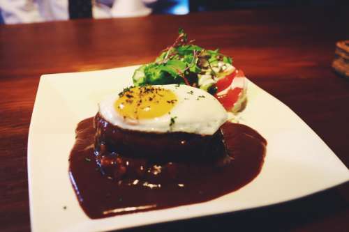 黃身を割り、ハンバーグと一緒に頬張ると、まろやかなたま