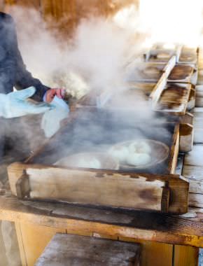 併設(shè)された「溫泉蒸し処」では、間歇泉の溫泉の蒸気を利用して、魚(yú)介や野菜の蒸し料理が味わえる