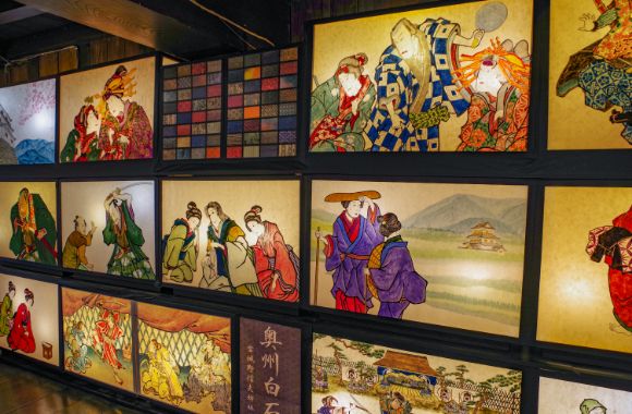 明治中期に建てられた豪商屋敷『壽丸屋敷(すまるやしき)』の店蔵では、白石和紙の歴史をたどる展示のほか、白石和紙を使ったアーティストの作品を常設展示。流木や蔓枝(つるえだ)を使った「白石和紙あかり」や「うちわ」など、1日で完成するワークショップもここで開催されています。一面の壁いっぱいに飾られた「あかり絵」は、歌舞伎や浄瑠璃の人気演目で、地元白石が舞臺の『白石噺(ばなし)』を描いたもので、その鮮やかさに目を奪われます。