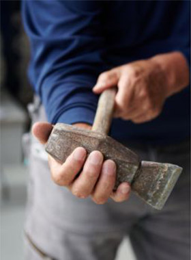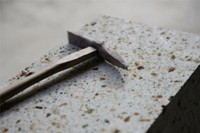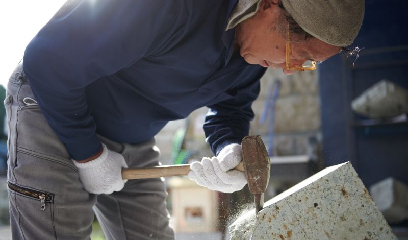 大谷石の特徴でもある、肌面に散らばる白色や青色、茶色のさまざまな斑點は、石英や長石類、黒雲母、輝石など、異なる石質の固まり。「ミソ」と呼ばれる茶色の斑點のように、時が経てば空洞になるような脆い粘土質も混在しています。ひとつの石塊でも場所によって石質が違うので、石を叩いたときに伝わる感觸で、次に出てくる層を瞬時に見分けるのだとか。「柔らかくて加工しやすい反面、打ち方の力加減を間違えると思った以上に大きく割れる。そこが緊張するし、そこが大谷石の面白いところ」と、渡邉さんは語ります。