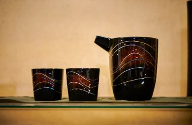 (寫真左下)ヤコウガイ薄貝や金粉で、水と風を表現した「螺鈿(らでん)蒔絵片口酒器」